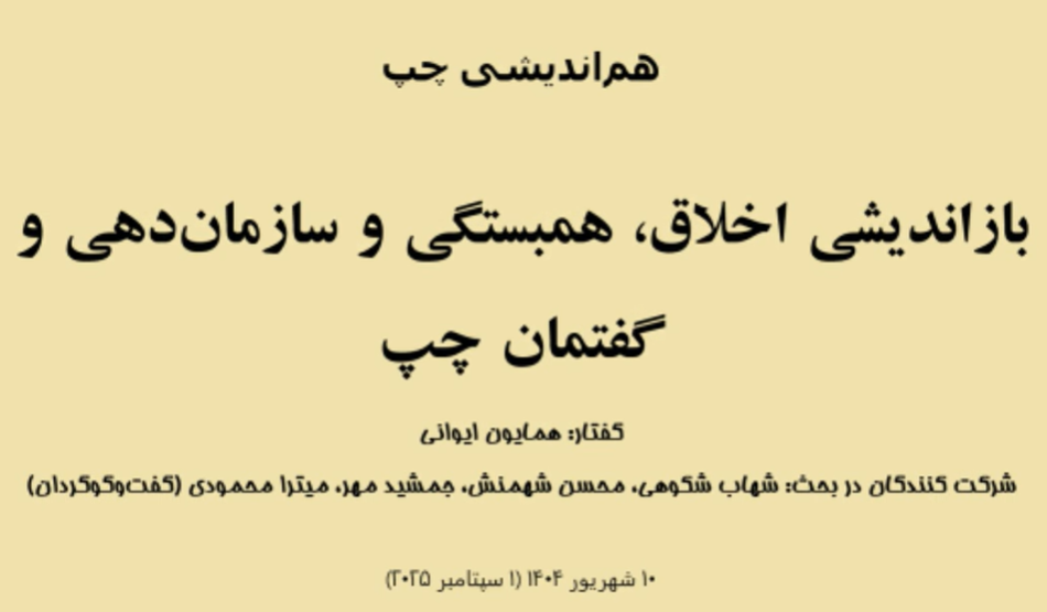 در ادامهی مباحث #پروندهی_سازمانیابی، در پست حاضر فایل صوتی گفتوگویی را بازنشر میکنیم که چندی پیش به ابتکار رفقای “هماندیشی چپ” با عنوان “بازاندیشی اخلاق، همبستگی و سازماندهی و گفتمان چپ” تهیه و منتشر شده است. در این گفتگو، نخست رفیق همایون ایوانی نکاتی را حول چالشهای سازماندهی چپ در دورهی سلطهی فرهنگی نئولیبرالی طرح میکند و سپس از خلال پرسشها و نقطهنظرات رفقای حاضر (میترا محمودی -مجری-، شهاب شکوهی، محسن شهمنش و جمشید مهر) بحثی جمعی حول این موضوع انجام میگیرد.
